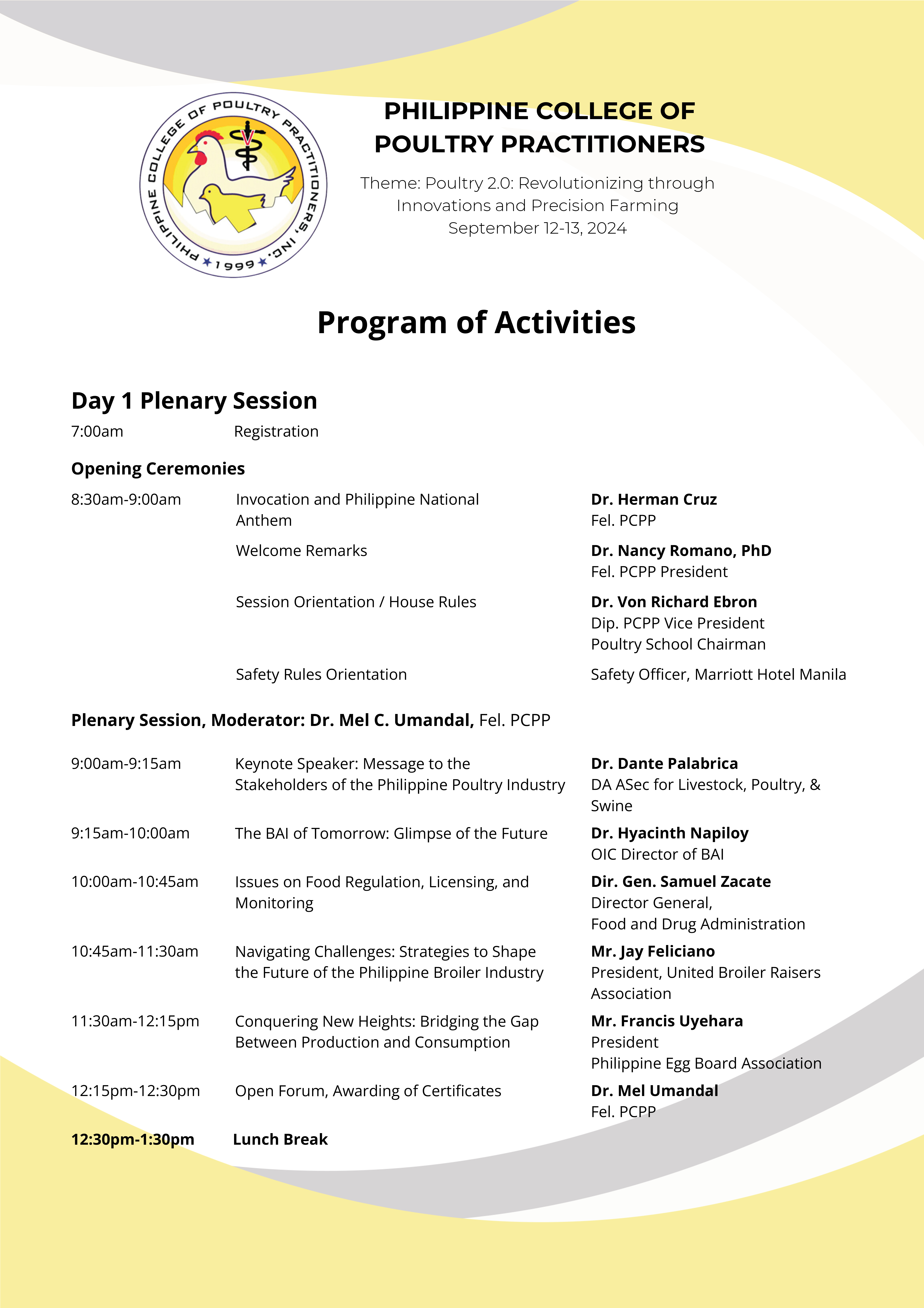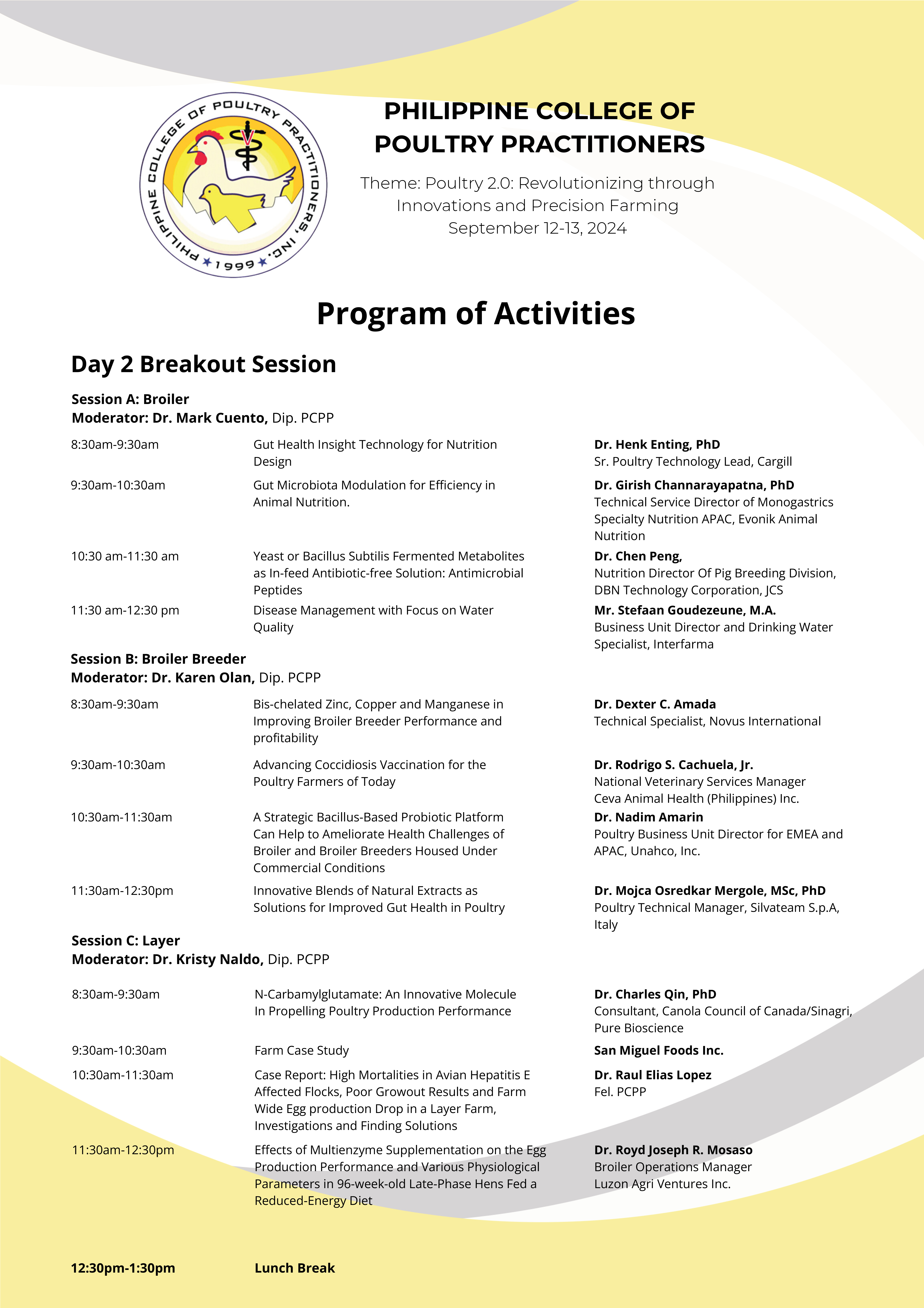 The objective of the 2024 Poultry School is to provide a framework that goes beyond management, disease diagnostics, marketing trends and disease prevention and control. Thus, we see the importance of having compliance and familiarity with appropriate statutory and regulatory requirements as one of the topics of this year’s Poultry School. Moreover, there will still be focus sessions on emerging and re-emerging diseases, new housing technologies, updates on animal nutrition and best management practices.
